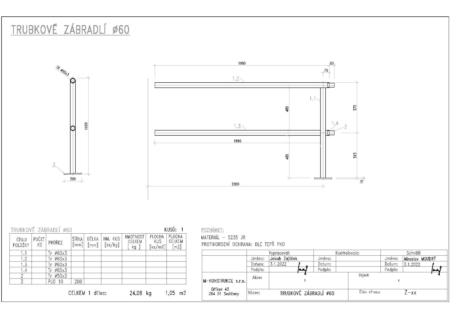 Zadavatel specifikuje, že se jedná o ocelové trubky o průměru 60 mm, s povrchovou úpravou žárovým zinkováním. Kotvení zábradlí bude provedeno pomocí čtyř kotev M14 do opěrné zídky. Pro bližší určení je přílohou tohoto vysvětlení výkres s názvem: „trubkove zabradli“.